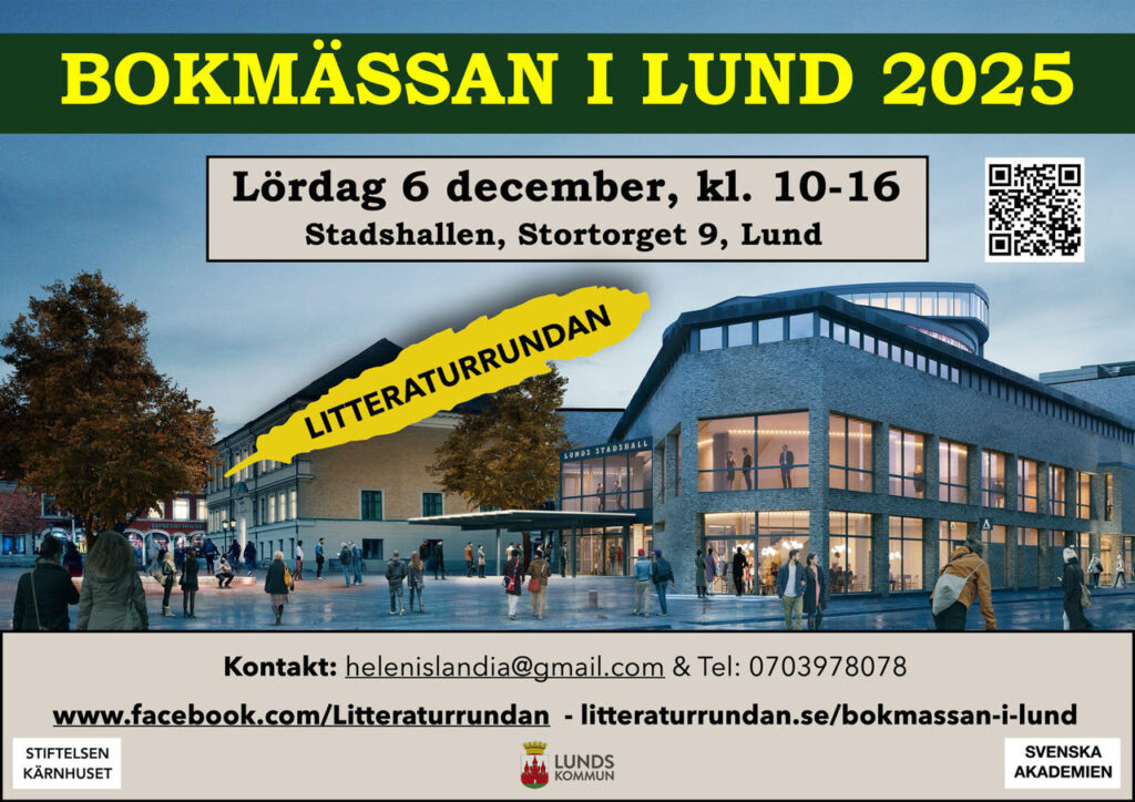 Bokmässan i Lund arrangeras för 6:e gången av föreningen Litteraturrundan med stöd från Svenska Akademien, Stiftelsen Kärnhuset och Lunds kulturförvaltning lördagen 6 december kl. 10 – 16 i Stadshallen i Lund.