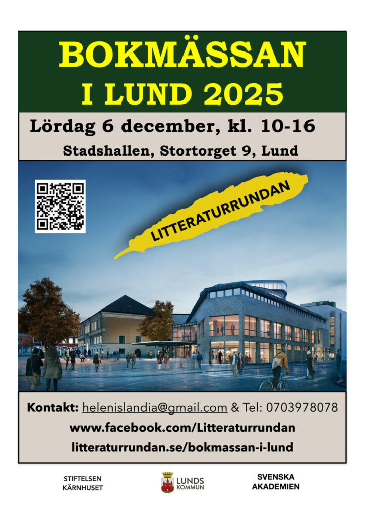 Bokmässan på Stadshallen i Lund äger rum lördagen den 6 december 2025 kl 10 – 16. Dagen kommer att omfatta bokbord, boksamtal, uppläsningar och mycket mer. Varmt välkommen!